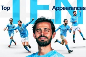 据统计,这是B席第437次代表曼城出场,跻身队史出场次数前十,具体榜单如下: