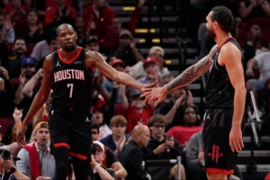 火箭(25-15):史密斯32分8板、申京21分8板4助5断、阿门20分8板6助、杜兰特18分6板8助、谢泼德11分3板1助、芬尼-史密斯8分3板、亚当斯5分10板2助、奥科吉4分1板1助