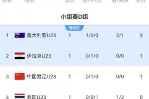 澳大利亚U23首轮取胜排名小组榜首,U23国足与伊拉克同积1分,但由于U23国足黄牌数多,所以排名第3。泰国U23垫底。