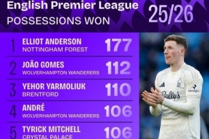体育资讯1月10日讯 数据机构squawka统计了本赛季英超赢得球权情况,诺丁汉森林中场埃利奥特·安德森独自领跑。