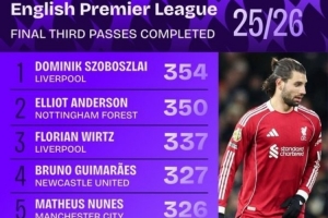 本赛季英超进攻三区成功传球榜:
