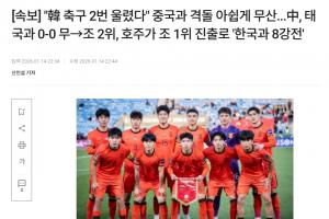 韩媒标题为:韩国足球两度饮恨,与中国对决遗憾落空(中国0-0战平泰国获小组第二,澳大利亚头名晋级将与韩国会师)